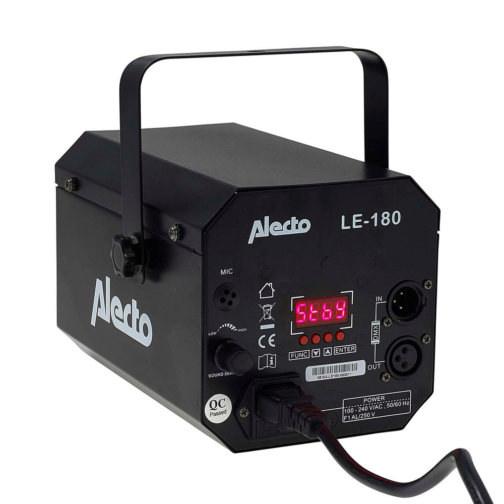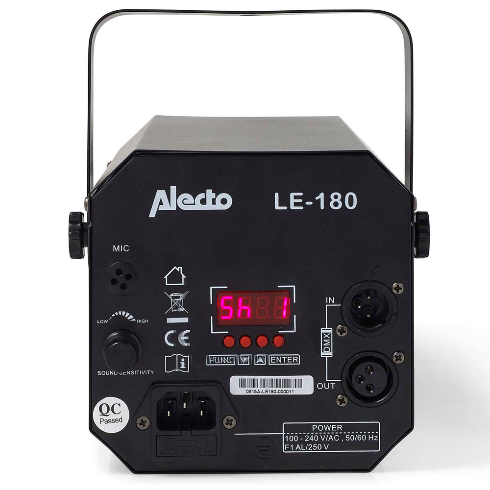 Le projecteur disco LED LE-180 est livré avec sept spectacles de lumière préprogrammés. Vous pouvez également le laisser s'harmoniser avec la musique. La LE-180 ajuste sa vitesse en fonction du bruit ambiant capté par son microphone intégré. Plus le bruit est fort, plus le rythme s'accélère. La sensibilité du capteur est réglable à l'arrière de la lampe.