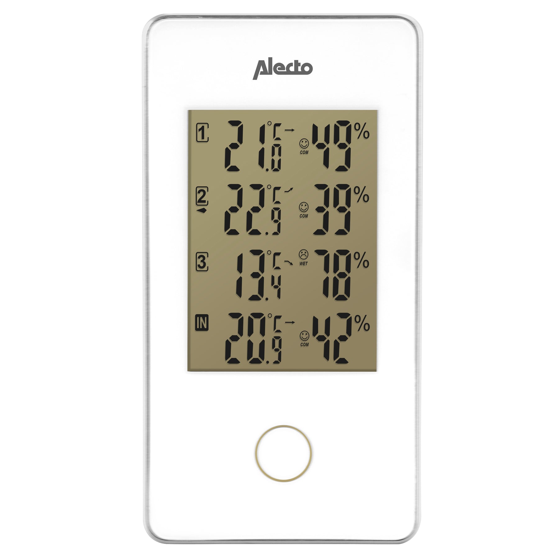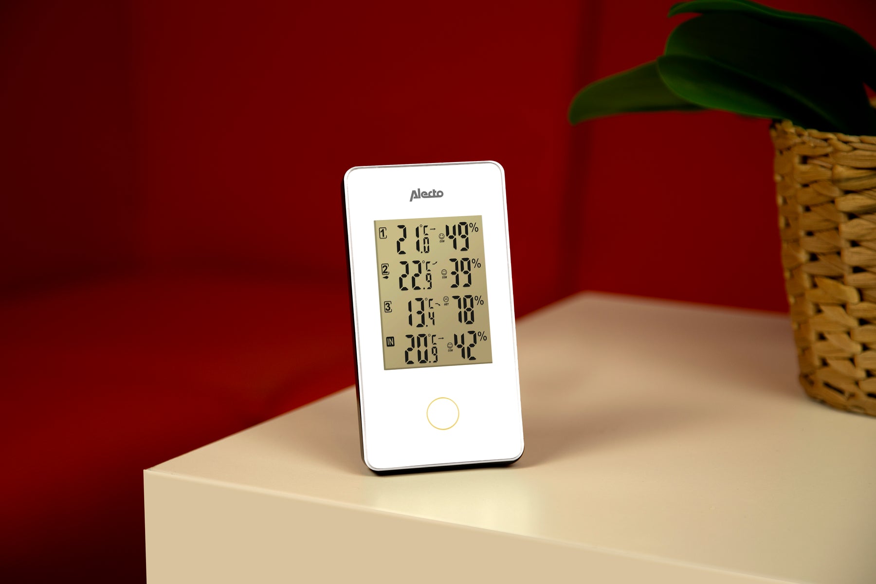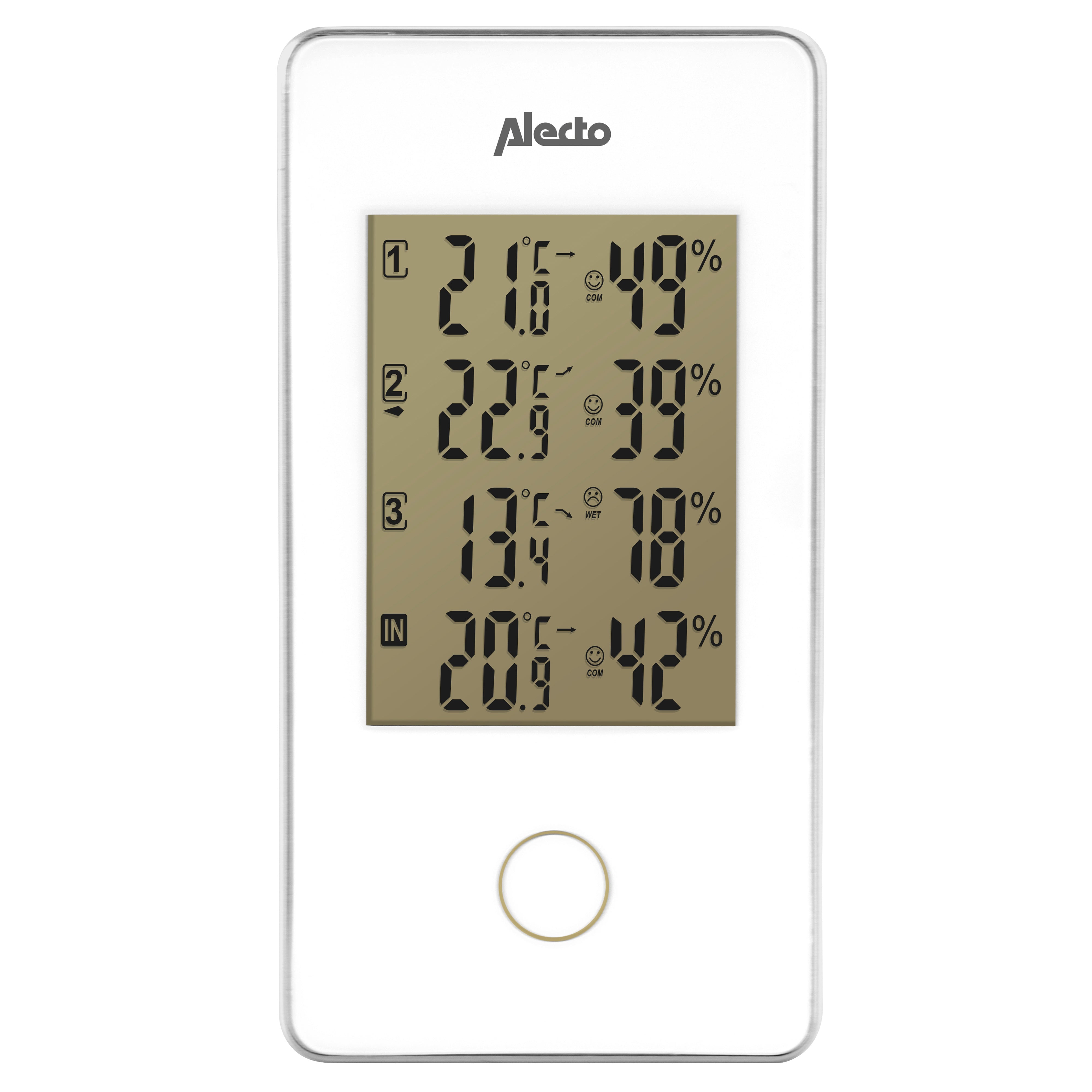 L'unité intérieure magnifiquement conçue - qui ne semble pas déplacée sur un placard ou un rebord de fenêtre, mais peut également être montée au mur - affiche la situation météorologique à trois endroits de manière claire et intelligente. Les trois capteurs extérieurs mesurent la température et l'humidité in situ. Ces mesures sont transmises sans fil à l'unité intérieure et affichées sur le grand écran. Vous pouvez y lire la température et l'humidité en valeurs numériques, mais aussi voir à quel point c'est agréable grâce à des smileys. Vous pouvez ainsi répondre immédiatement à des questions telles que : "Pourrions-nous être déjà dans le jardin ? ou "Est-ce plus agréable dans le jardin d'hiver ou sur la terrasse ?