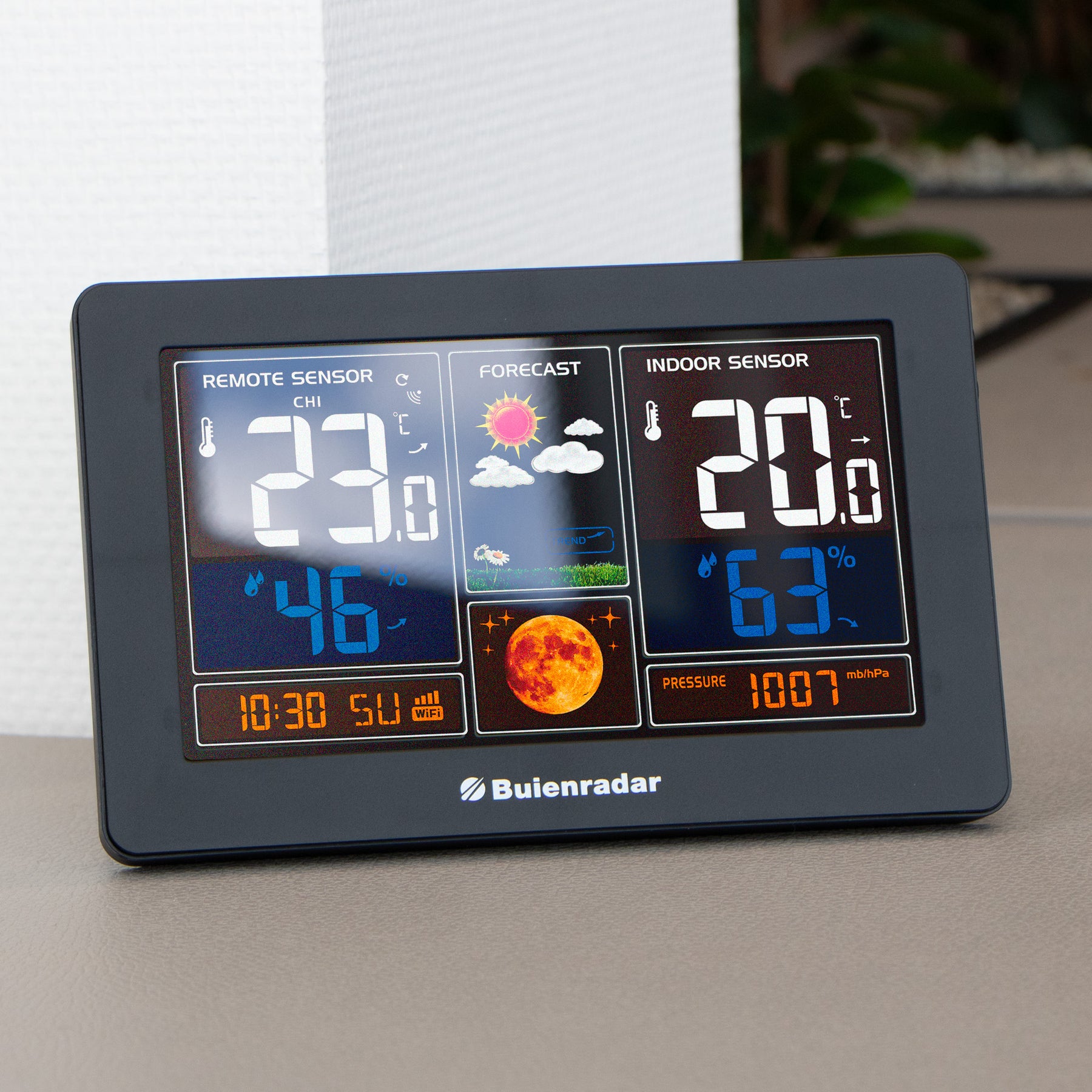 L’écran du radar météorologique BR900 affiche également la date, le jour et l’heure. Elle est parfaite pour la table de chevet mais peut également être suspendue.