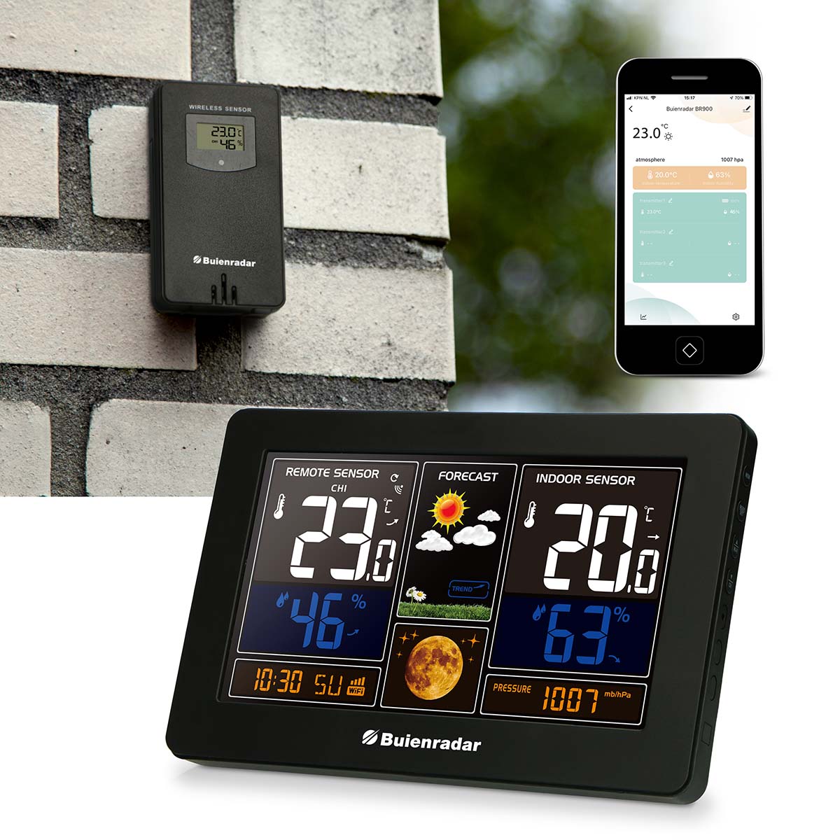 Buienradar BR900 - Station météo 3 en 1 avec Wi-fi, app et capteur extérieur sans fil , noir
