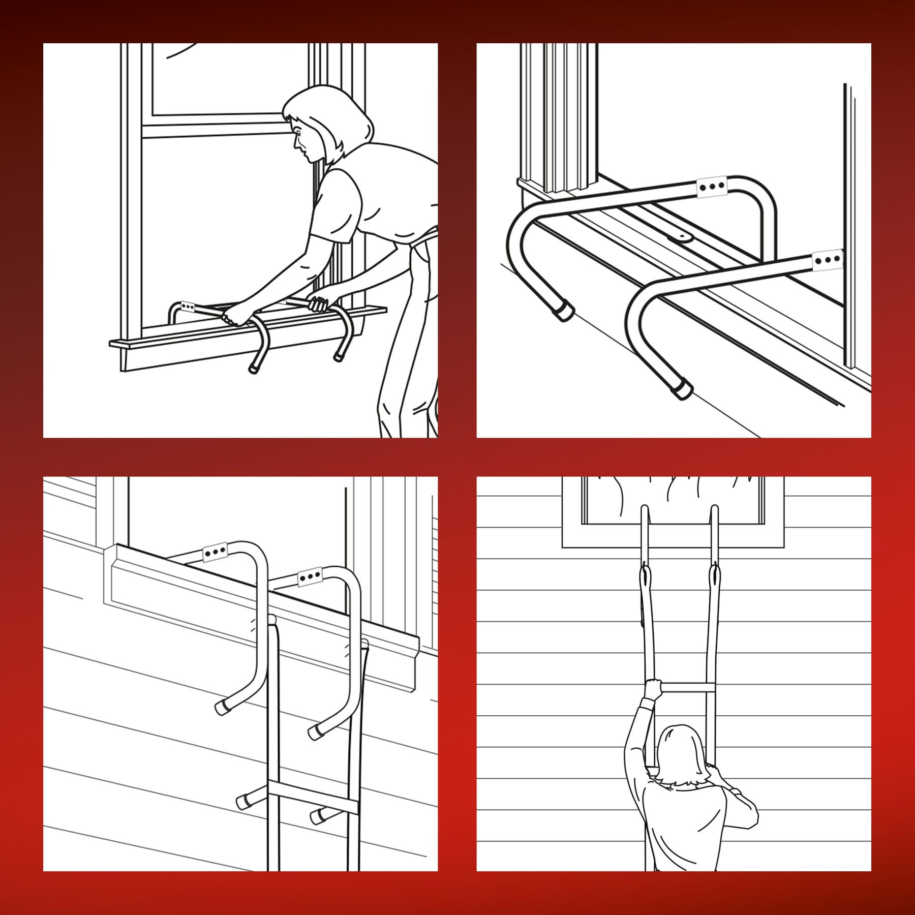Il est toujours recommandé d’associer une échelle de secours à d’autres mesures de prévention, telles qu’un détecteur incendie. Si malheureusement une urgence survient malgré tout, il est bon que tous les occupants du foyer sachent où se trouvent l’échelle de secours. L’échelle de secours vous permet, à vous et à votre famille, de vous mettre en sécurité en quatre étapes :