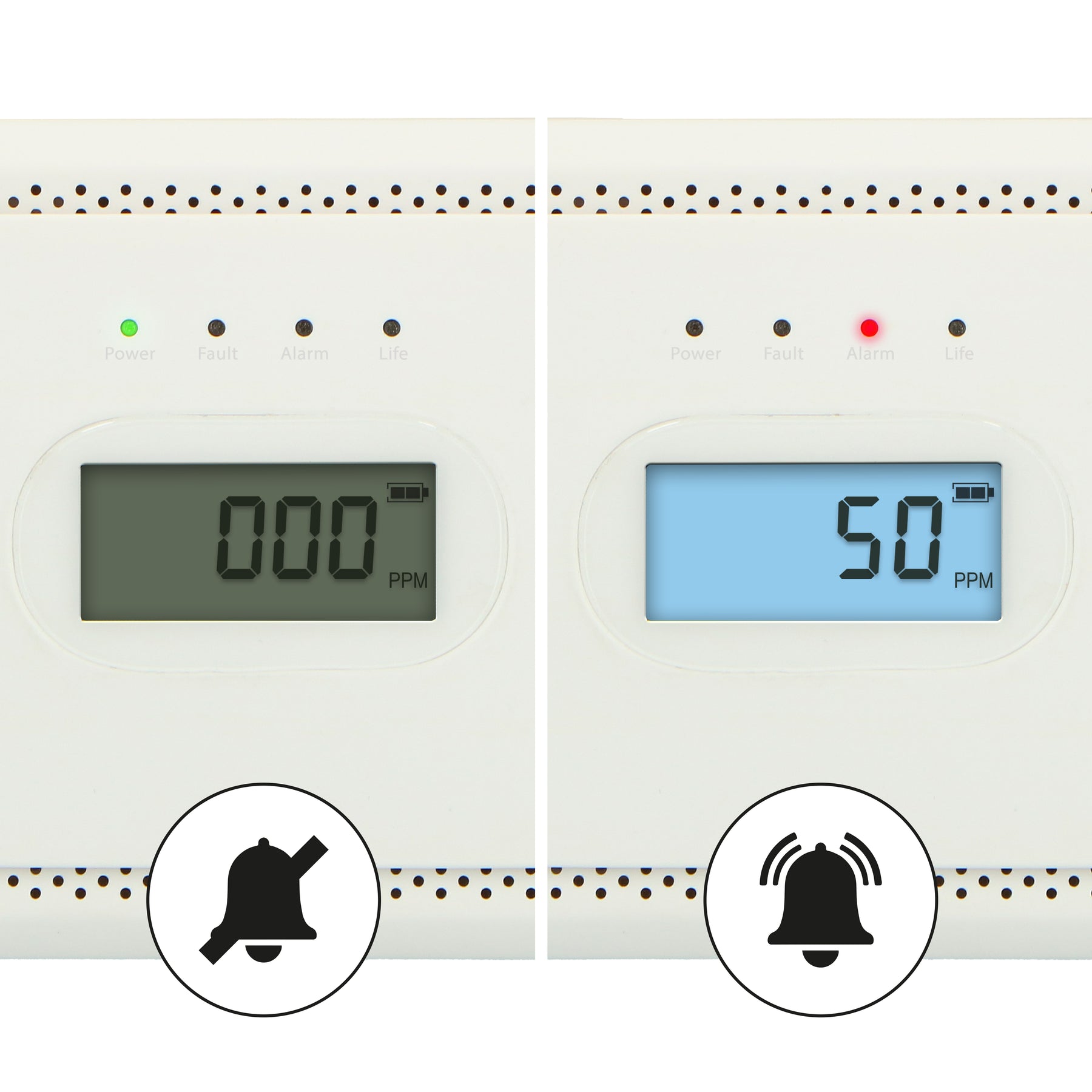 Les détecteurs de monoxyde de carbone indiquent la concentration en monoxyde de carbone en ppm. Il s’agit des parties par million, soit le nombre de particules pour un million de particules. Légalement, les détecteurs de monoxyde de carbone doivent émettre une alarme en cas de détection d’une concentration en monoxyde de carbone de 50 ppm ou plus pendant 60 minutes. L’alarme de plus de 85 dB ne passera pas inaperçue, même si vous dormez.