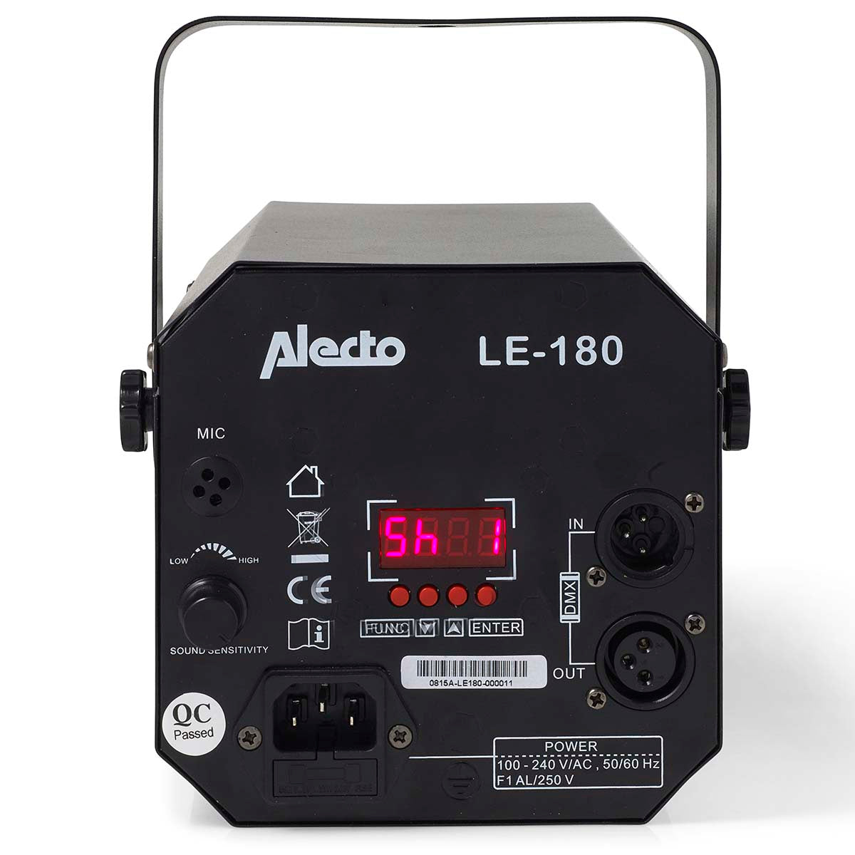 Le projecteur disco LED LE-180 est livré avec sept spectacles de lumière préprogrammés. Vous pouvez également le laisser s'harmoniser avec la musique. La LE-180 ajuste sa vitesse en fonction du bruit ambiant capté par son microphone intégré. Plus le bruit est fort, plus le rythme s'accélère. La sensibilité du capteur est réglable à l'arrière de la lampe.