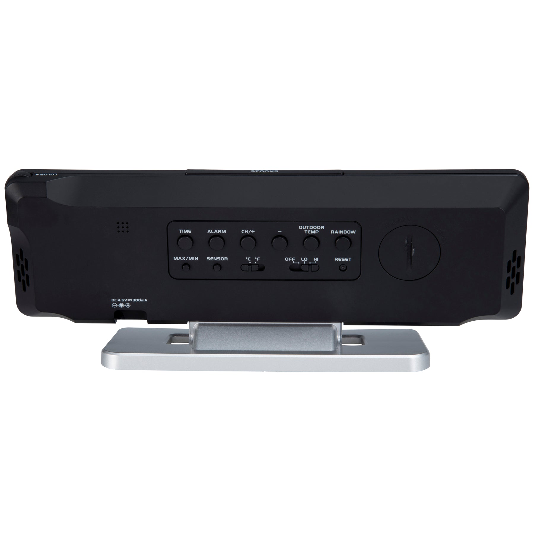 La station météo numérique WS-2500 d'Alecto avec capteur extérieur sans fil a un design élégant. La WS-2500 démarre immédiatement avec le signal du capteur extérieur, si celui-ci est alimenté par 2 piles AA de 1,5V et que la station météo est connectée à l'adaptateur. L'écran rectangulaire de la station météo sans fil affiche l'heure, la date, la température intérieure et extérieure et la pression atmosphérique. Mais aussi le taux d'humidité intérieur et extérieur et les prévisions météo. Les prévisions météo sont illustrées par des icônes faciles à comprendre. Sur la base de la pression atmosphérique, la station météorologique calcule la météo pour les 12 à 24 prochaines heures. L'Alecto WS-2500 a des fonctions d'alarme réglables pour la baisse et la hausse de la température et de l'humidité.