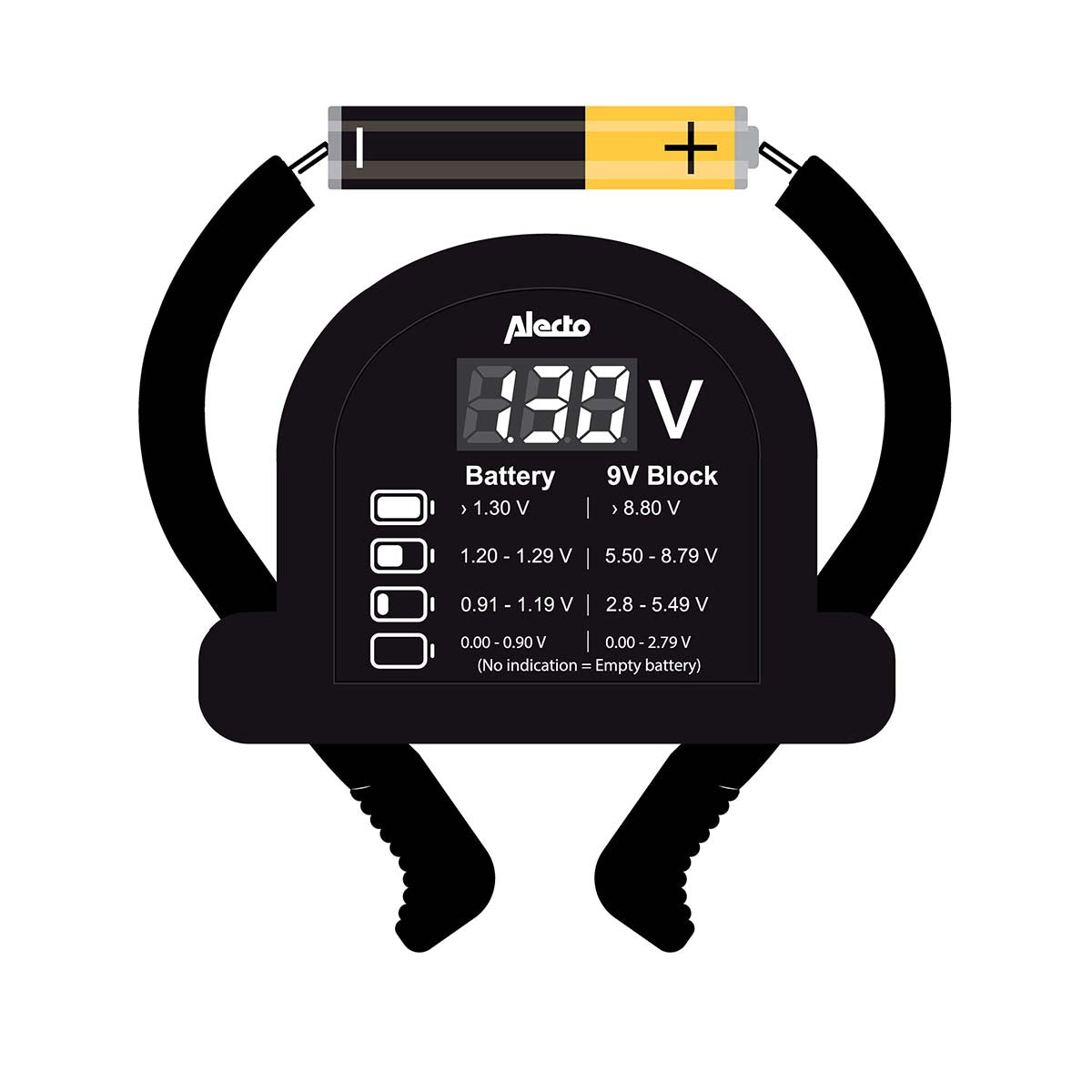 Alecto BTT2 - Testeur de piles universel compact pour piles AA, AAA, C, D et 9V - Noir
