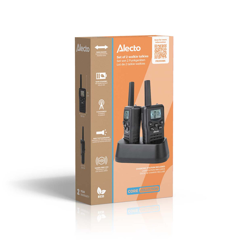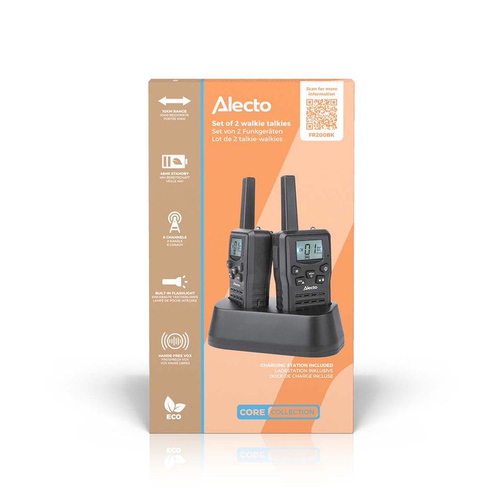 Alecto FR200BK - Set de 2 talkies-walkies rechargeables avec portée jusqu'à 10 km et fonction mains libres VOX - Rechargeable via la station de charge et USB-C - Noir