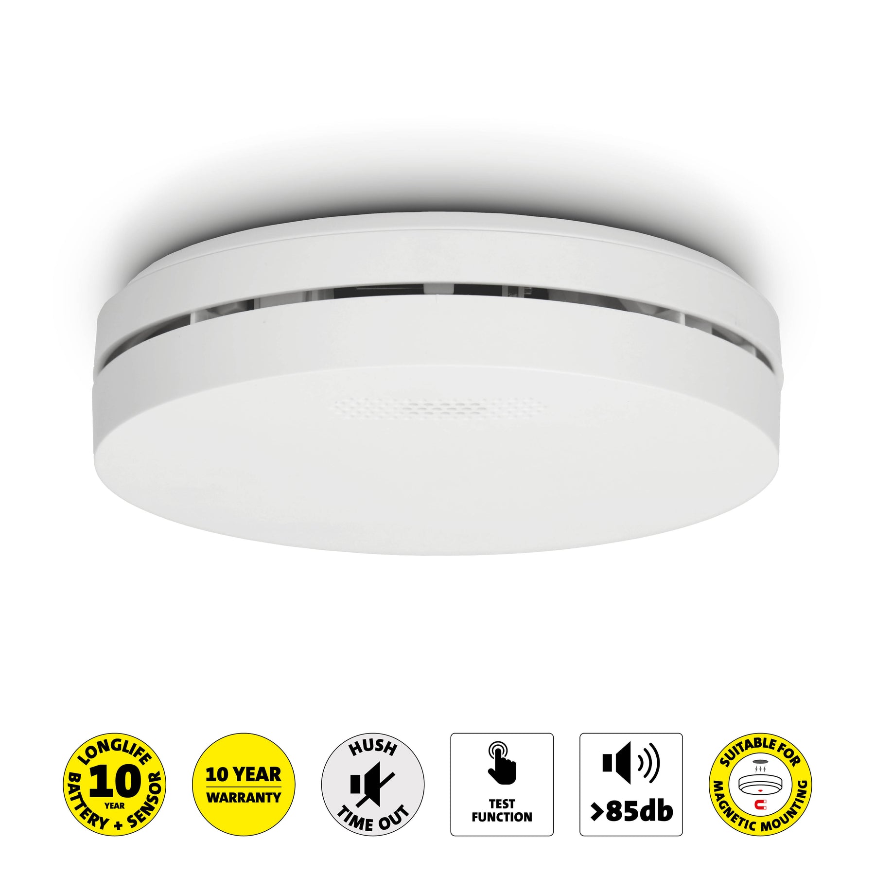 Ce détecteur de fumée au design ultra-fin est équipé d'une pile au lithium d'une durée de vie de 10 ans, fiable et éconergétique. Le capteur optique de grande qualité a également une durée de vie de 10 ans. De cette façon, vous serez alerté en cas de fumée ou d'incendie à la maison. Ce produit possède une garantie de 10 ans. Si la pile est presque vide, vous recevrez un avertissement.