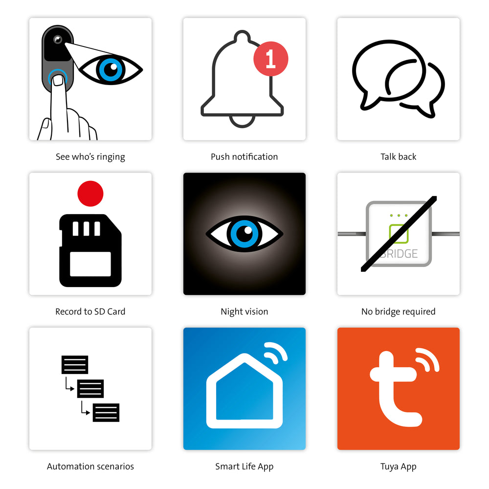 Avec cette sonnette Wi-Fi intelligente équipée d’une caméra, vous voyez qui sonne à votre porte, où que vous soyez. Vous recevez immédiatement une notification push sur votre smartphone et/ou votre tablette via l'application gratuite Smart Life. Même si vous êtes absent, vous pouvez parler à la personne devant votre porte grâce à cette application.