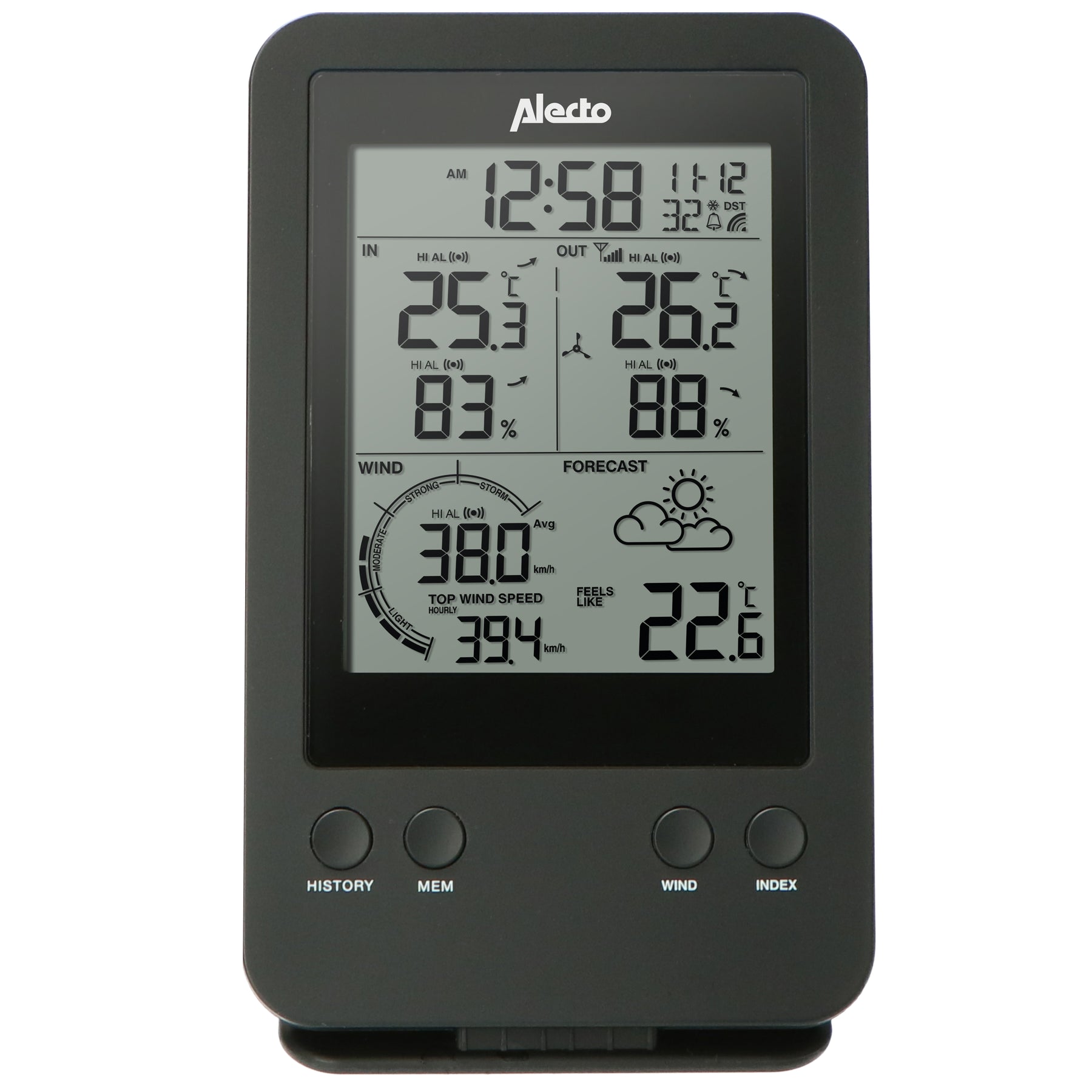 Vous pouvez bien sûr faire beaucoup plus avec cette station météo de haute qualité que de simplement mesurer la température. Dans de nombreuses situations, il est utile de savoir quel temps il fait ou fera. Si vous avez une randonnée à vélo le dimanche, la vitesse du vent est une information précieuse. Soyez automatiquement averti de la présence de verglas ou de routes glissantes avant de monter dans votre voiture. Avec la station météo WS-3400, vous avez tout ce dont vous avez besoin pour devenir le meilleur prévisionniste météo !
