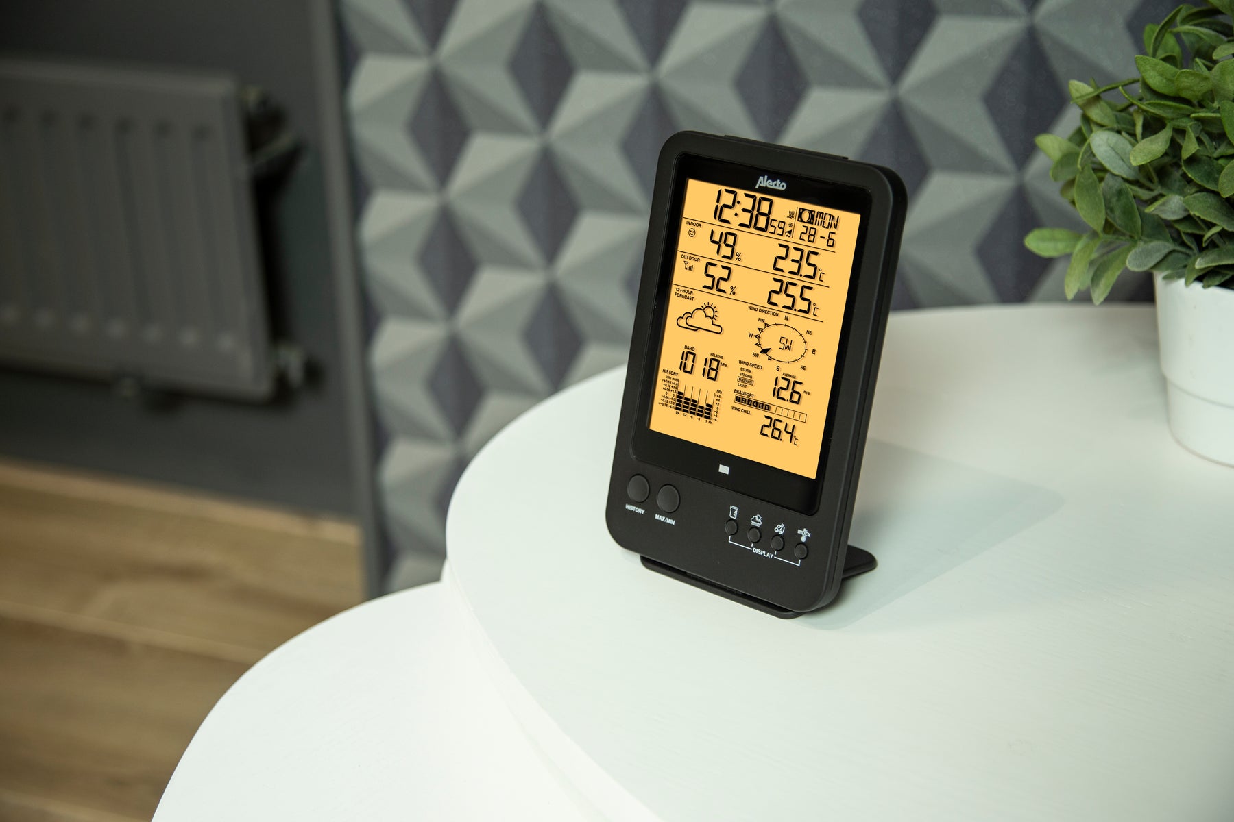 Nous avons également pensé à la facilité d'utilisation, comme une fonction d'alarme avec répétition et une notification lorsque la batterie est faible ou que vous vous trouvez hors de portée du mât. Cette portée, soit dit en passant, est de 100 mètres dans un champ ouvert. Enfin, le présentoir peut être monté sur une table ou au mur. Avec cette station météo, vous choisissez un appareil intelligent, flexible et polyvalent. Et avec Alecto, vous optez pour un produit bien pensé, convivial et de grande qualité.