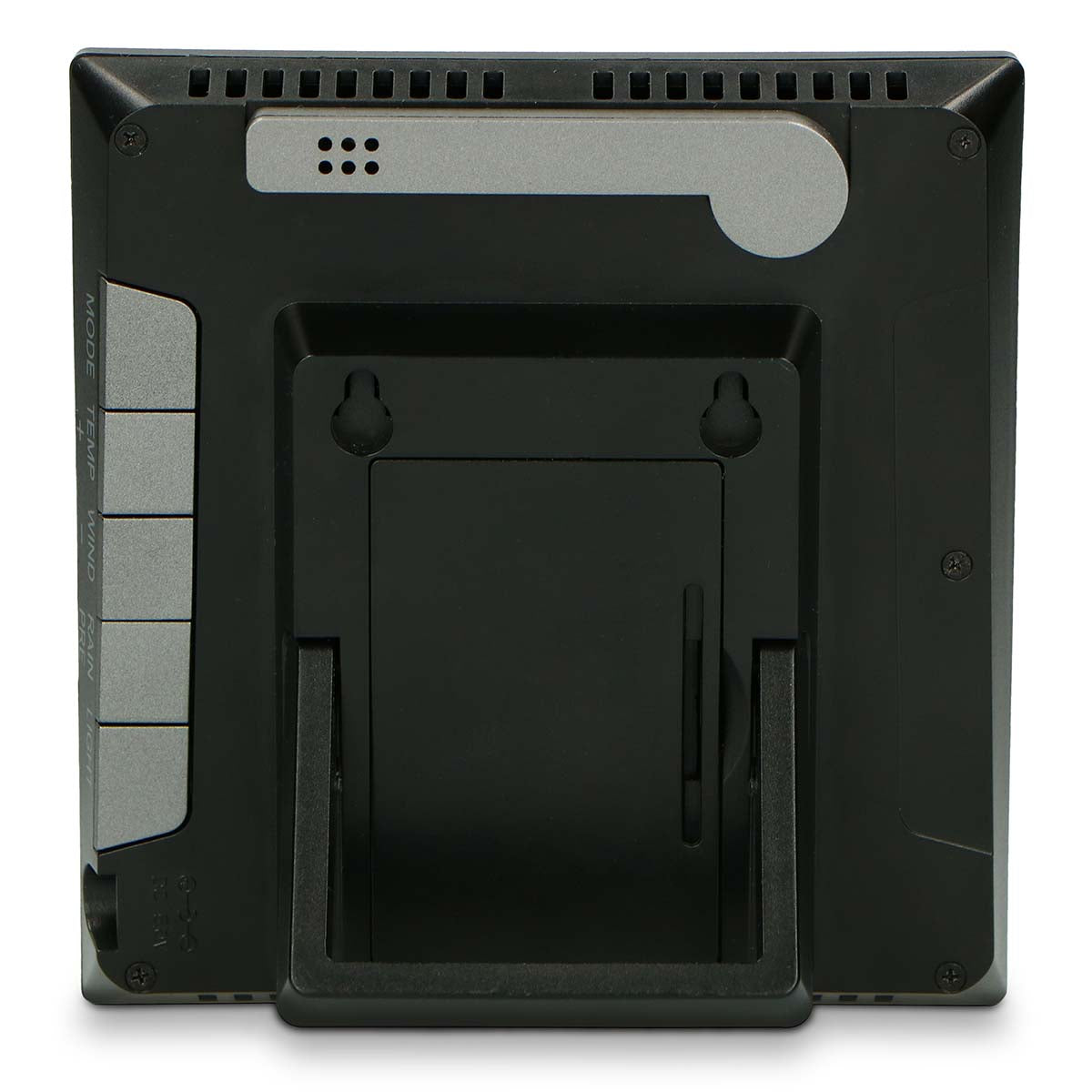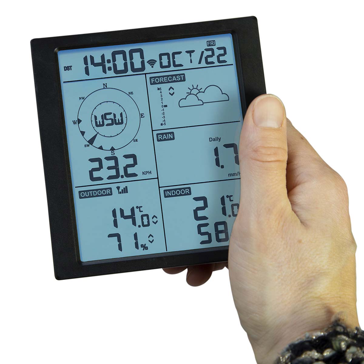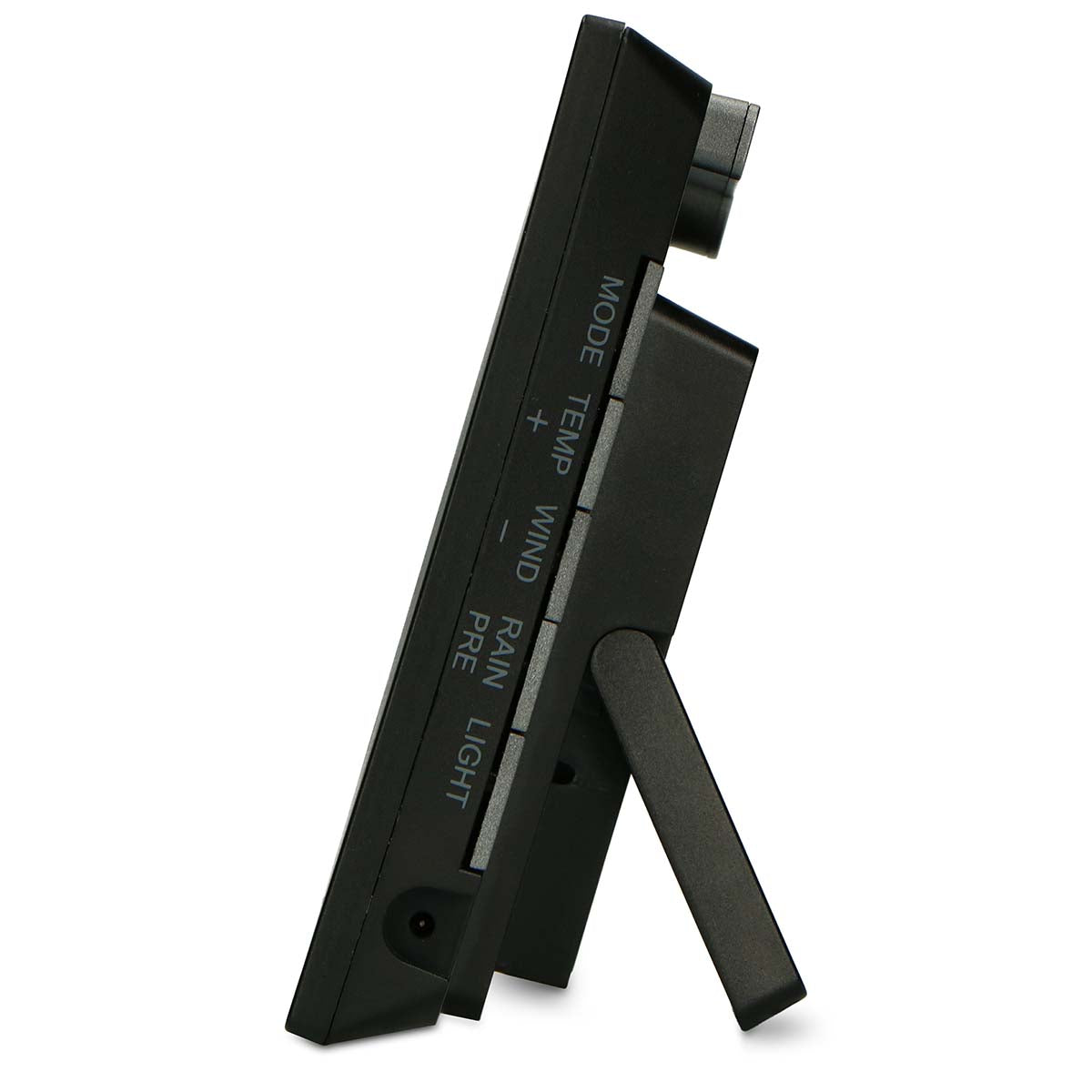 Parallèlement à l’application, vous disposez d’un écran de 4,9 pouces (diamètre de 12,5 cm), sur lequel vous pouvez lire clairement les valeurs de mesure mais également certaines données historiques. L’écran est équipé d’un éclairage, ce qui permet également une lecture parfaite dans le noir. La station météorologique Alecto WS-5200 affiche les prévisions et les conditions météorologiques mais également la date et l’heure. Vous pouvez la poser sur votre table de nuit ou sur un buffet ou la suspendre au mur.