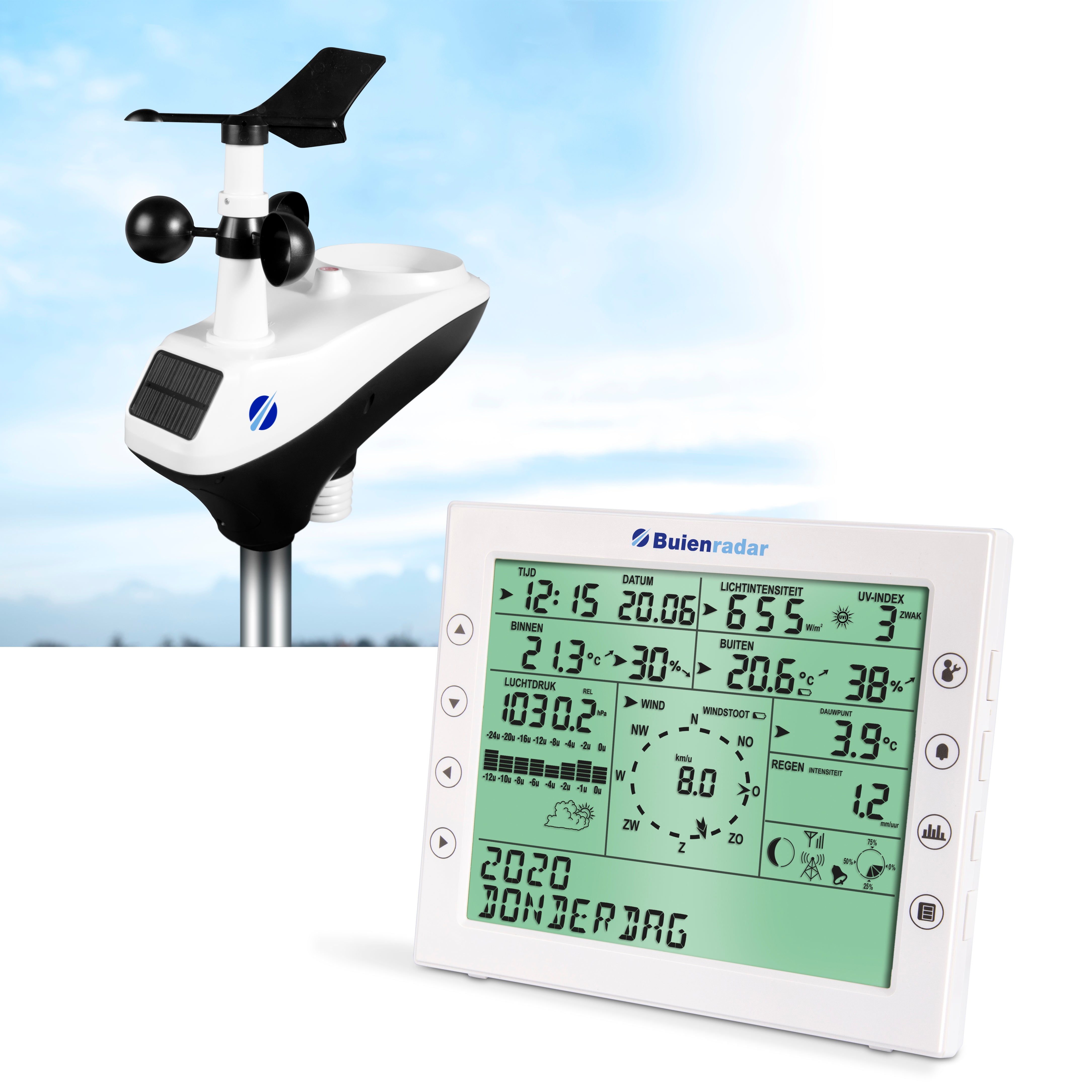 Avec la station météo domestique BR-1800 de Buienradar, la mesure météo professionnelle est possible pour tous les passionnés de météo. Il se compose d'un mât avec divers capteurs pour une utilisation en extérieur (l'unité extérieure) et d'un bel affichage de mesure pour l'unité intérieure.