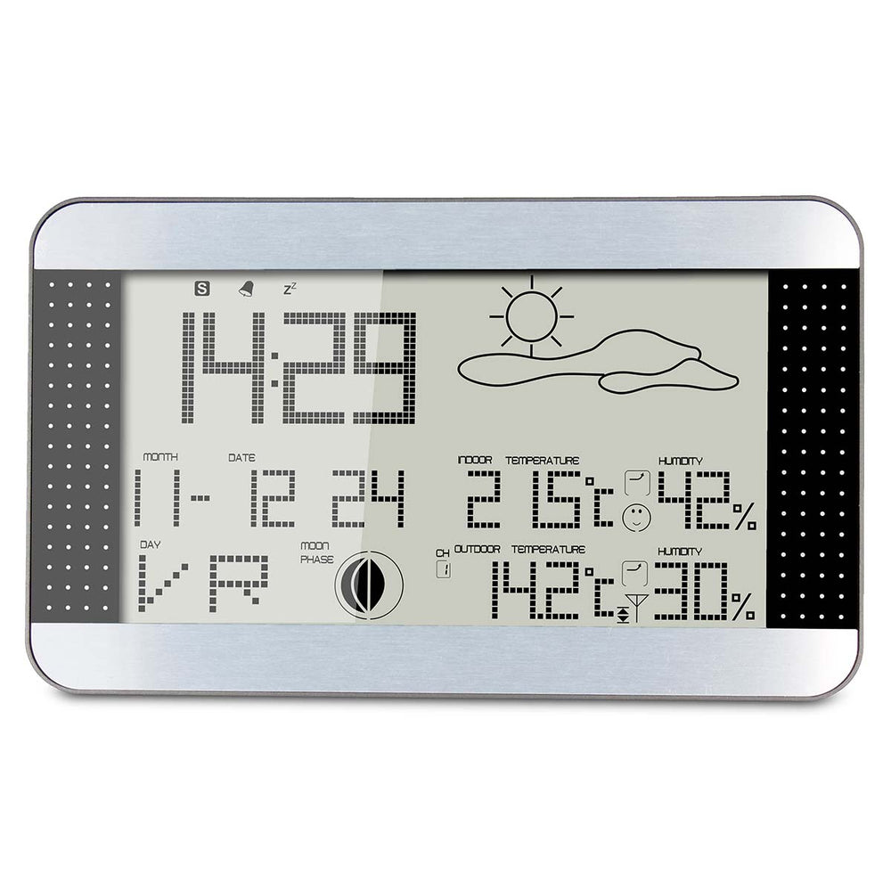 Les prévisions météo animées vous donnent toutes les informations en un seul coup d’œil, notamment la température et le taux d’humidité à l’intérieur comme à l’extérieur. Votre appareil garde en mémoire la température et l'humidité les plus basses et les plus élevées au cours des dernières 24 heures. Vous pouvez également y lire la phase de la lune et programmer une alarme si la température est trop basse ou trop élevée. Enfin, votre station météo est équipée d’un réveil avec la date et calendrier perpétuel et un témoin de faible batterie.